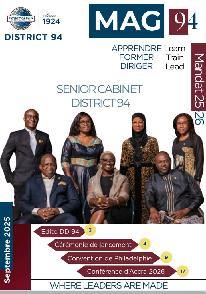 Chers Toastmasters du district 94.L’equipe PRM du District 94 , sous le leadership de la Directrice du District 94 ont choisi de doter au cours de ce mandat le district d’un Magazine: MAG 94.