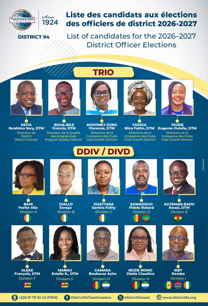 C’est avec honneur que je vous présente les candidats aux prochaines élections du District 94, qui se tiendront lors de notre Conférence à Accra.